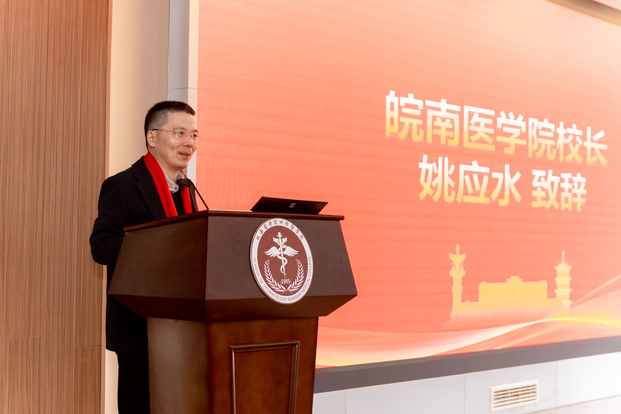 姚应水作总结讲话。他代表学校对口腔医学院校友会成立表示祝贺,向返校校友致以诚挚欢迎。姚应水回顾了学校六十七载栉风沐雨的跨越式发展历程,指出我校作为安徽省最早开设口腔医学专业的高校之一,学院已斩获省级特色专业、一流本科专业建设点等多项资质,搭建起省市级科研平台并共建协同创新基地。结合"健康中国"战略对口腔医学的新要求,姚应水强调,学院需推动校企合作向"深度融合、共生共荣"升级,而这离不开校友力量的支撑。他对校友会提出五点期望,希望构建传承情谊的"温情驿站"、打造促进行业交流的"智慧平台"、建设资源共享的"合作枢纽"、构筑助力成长的"成长阶梯"、搭建回馈母校的"回馈通道",号召广大校友与母校携手推动口腔医学教育发展。