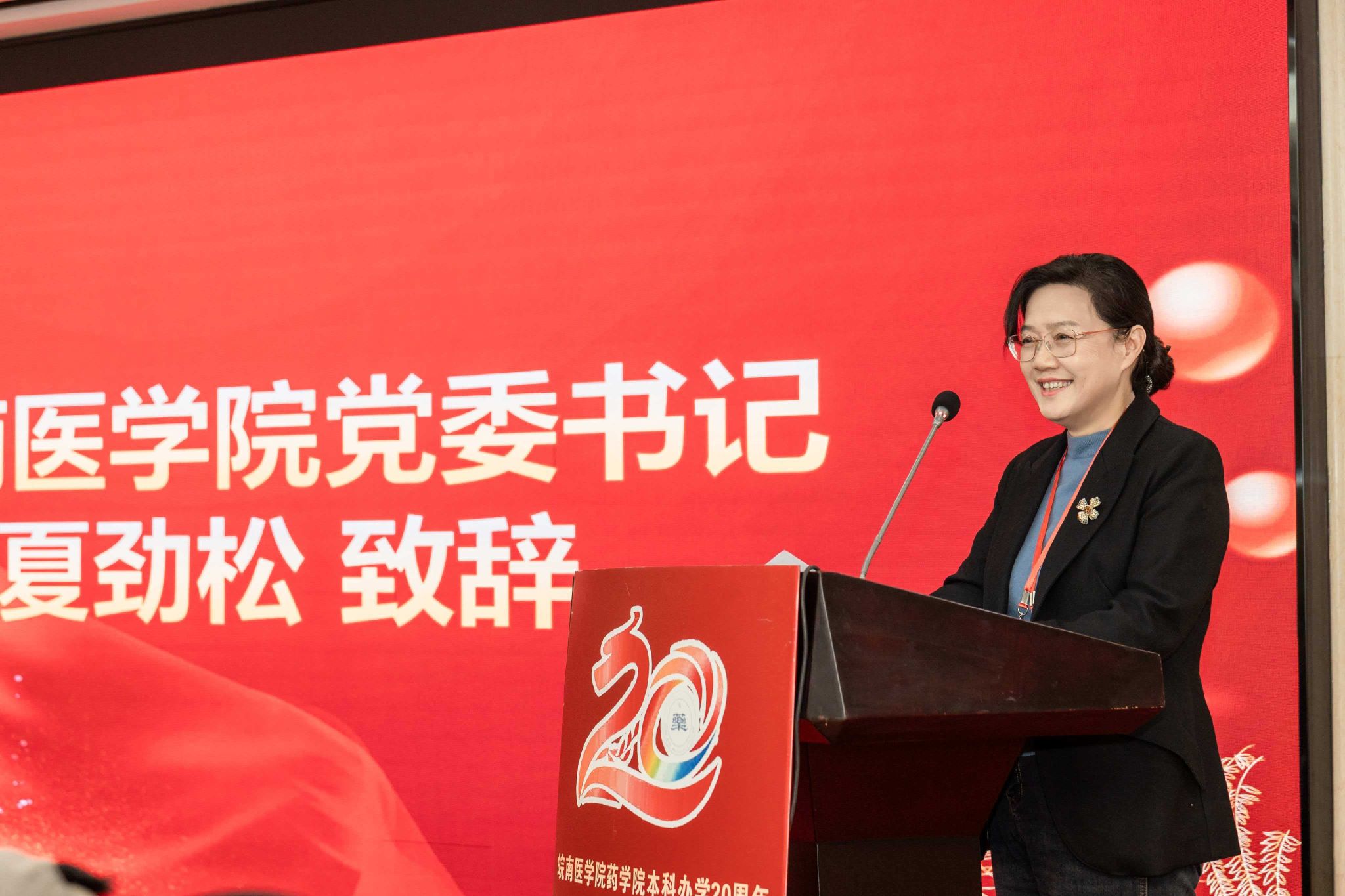 夏劲松代表学校向出席大会的校友表示热烈欢迎,向新当选的校友会成员致以祝贺,向长期关心药学院发展的顾问们表达感谢。她指出,药学院是学校建设高水平医科大学的“稳定器”与“增长极”,自汪舰担任院长以来,学院发展面貌焕然一新,就此向汪舰院长表达诚挚谢意,并向校友们系统介绍了母校近年来的发展成果。她表示,依托学校发展的良好态势,药学院从2005年成立药学系,到如今成长为在学科建设、人才培养、科学研究、社会服务等领域均取得瞩目成绩的药学院,实现了跨越式发展。夏劲松强调,校友是学校最宝贵的财富,也是最可信赖的力量。成立药学院校友会,核心是为广大校友搭建起联络情感、交流信息、共享资源、携手共进的平台,这既是校友们的共同心愿,更是学院与学校高质量发展的必然要求。针对药学院校友会未来工作,她提出三点希望:一是成为凝聚校友力量的“连心桥”,健全组织体系,广泛联络校友,增强凝聚力和影响力;二是成为助力校友发展的“加油站”,关注校友需求,组织多样活动,促进互动合作,欢迎校友参加校友论坛;三是成为支持母校建设的“助推器”,在人才引进、平台共建、联合攻关、成果转化等方面发力,为母校发展贡献力量。最后,夏劲松表示,母校将全力支持药学院校友会工作和校友发展。